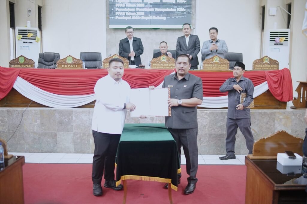 Rapat paripurna kemudian dilanjutkan dengan penandatanganan persetujuan penetapan kesepakatan KUA-PPAS Tahun 2026 oleh Bupati Subang bersama Ketua DPRD Subang, Victor Wirabuana Abdurachman, S.H.