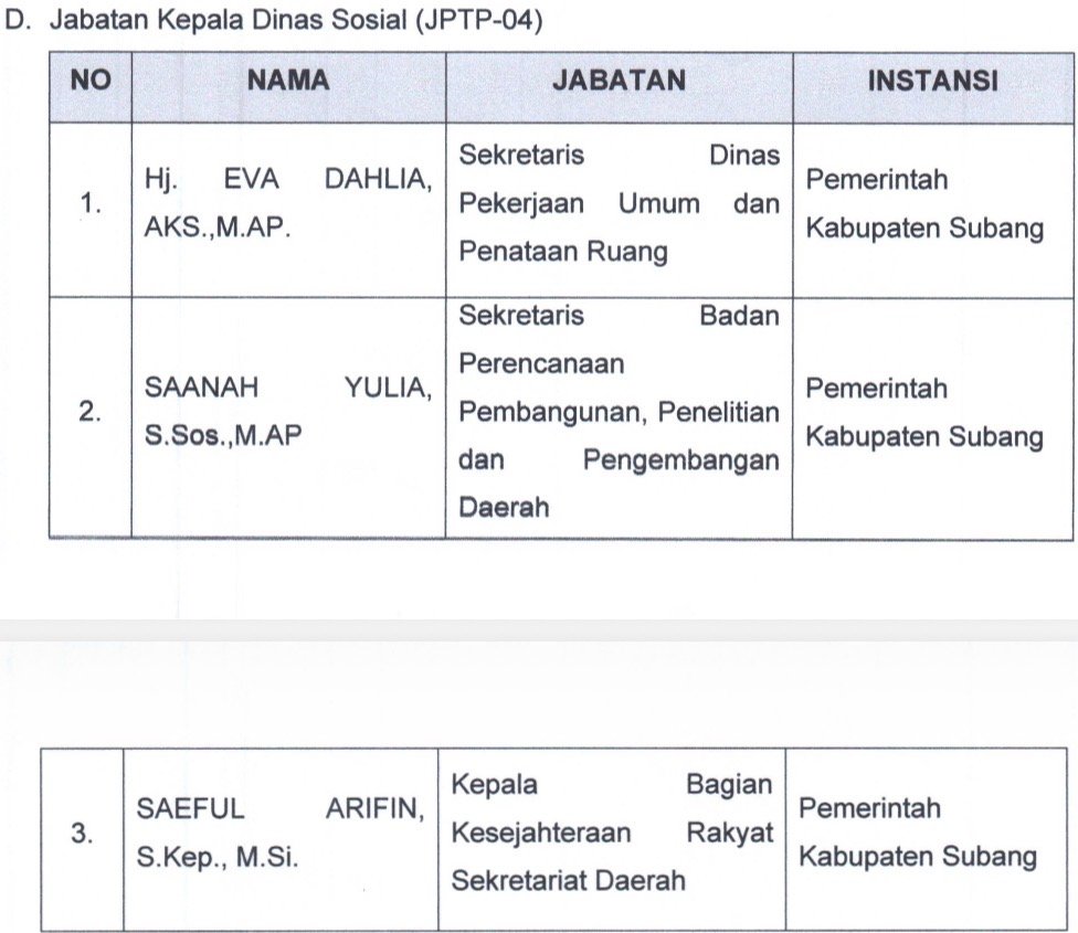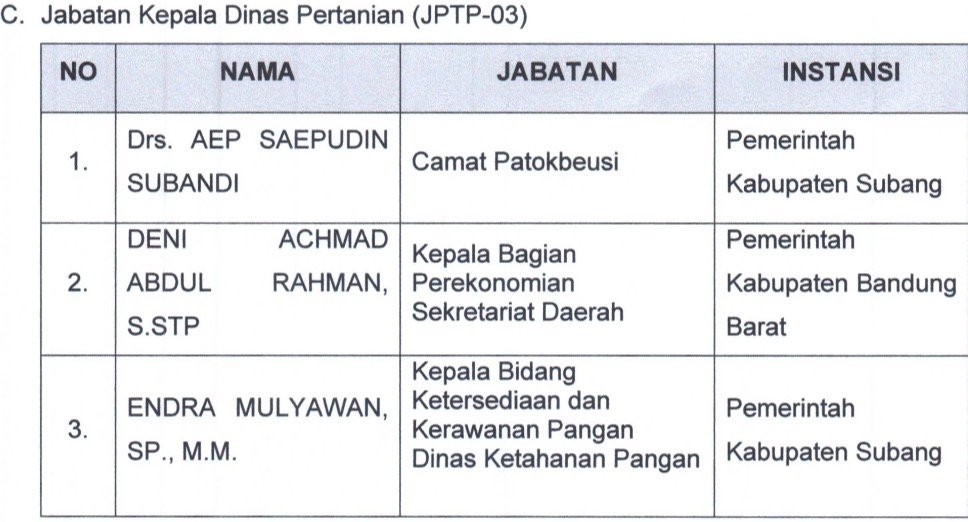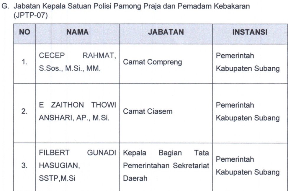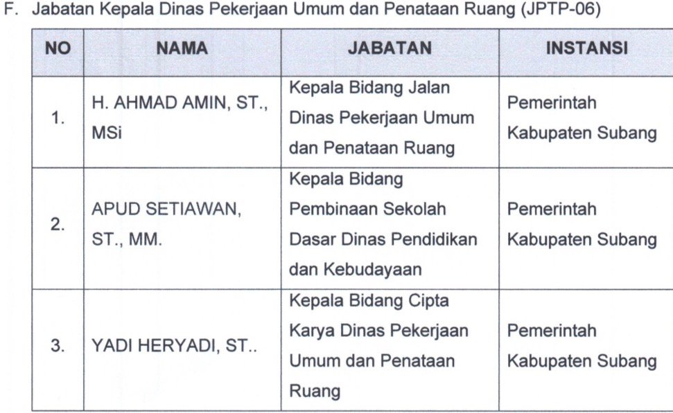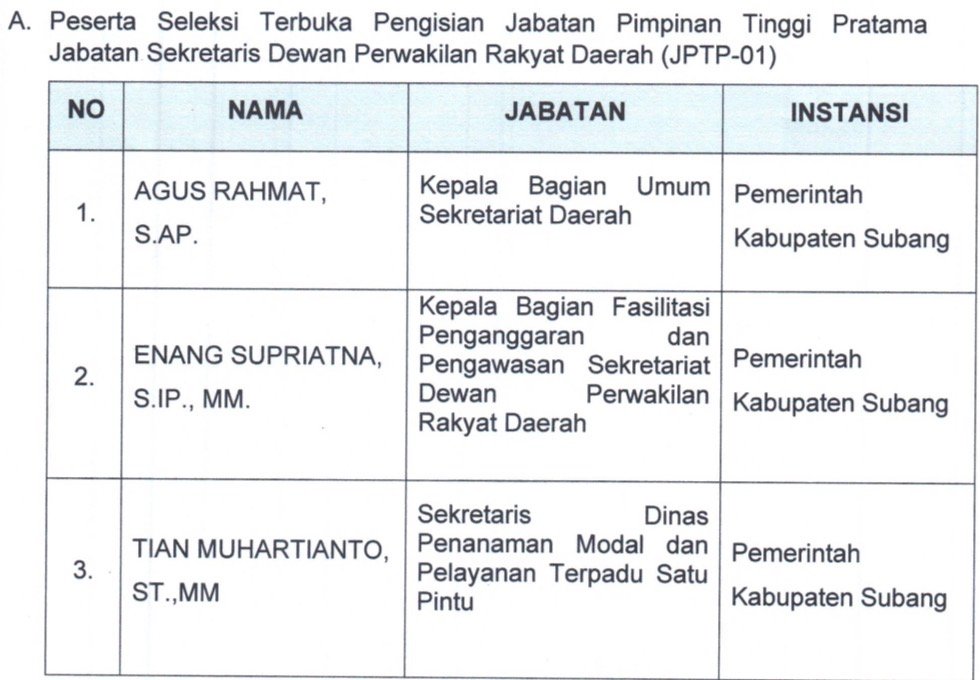 Berikut ini daftar nama tiga peserta terbaik pada masing-masing OPD hasil seleksi terbuka Jabatan Pimpinan Tinggi Pratama Pemkab Subang: